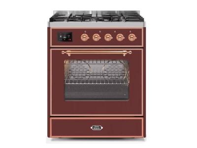 30" ILVE Majestic II Dual Fuel Liquid Propane Range with Copper Trim in Burgundy - UM30DNE3BUP-LP