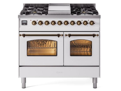 40" ILVE Nostalgie II Dual Fuel Natural Gas Freestanding Range in White with Bronze Trim - UPD40FNMP