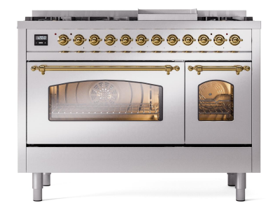 48" ILVE Nostalgie II Dual Fuel Natural Gas Freestanding Range in Stainless Steel with Brass Trim -