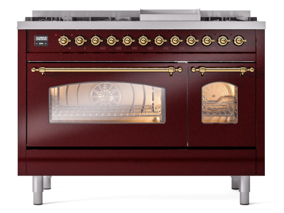 48" ILVE Nostalgie II Dual Fuel Natural Gas Freestanding Range in Burgundy with Brass Trim - UP48FNM