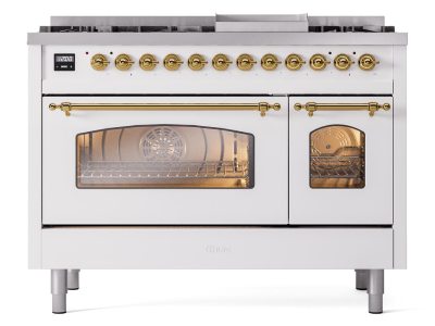 48" ILVE Nostalgie II Dual Fuel Natural Gas Freestanding Range in White with Brass Trim - UP48FNMP/W