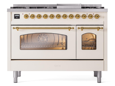 48" ILVE Nostalgie II Dual Fuel Natural Gas Freestanding Range in Antique White with Brass Trim - UP