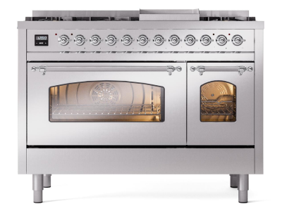 48" ILVE Nostalgie II Dual Fuel Liquid Propane Freestanding Range in Stainless Steel with Chrome Tri