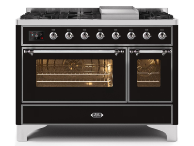 48" ILVE Majestic II Dual Fuel Range in Glossy Black with Chrome Trim - UM12FDNS3BKC-LP