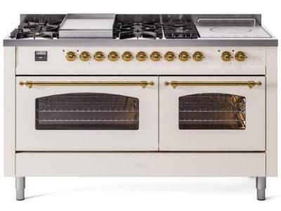 60" ILVE Nostalgie II Dual Fuel Liquid Propane Freestanding Range in Antique White with Brass Trim -
