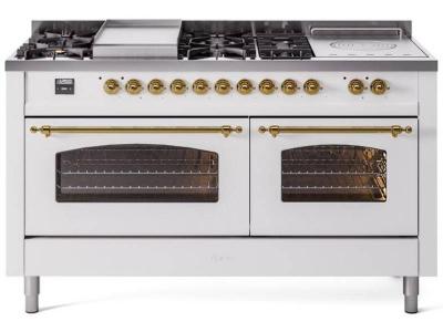 60" ILVE Nostalgie II Dual Fuel Liquid Propane Freestanding Range in White with Brass Trim - UP60FSN