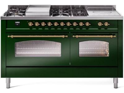 60" ILVE Nostalgie II Dual Fuel Liquid Propane Freestanding Range in Emerald Green with Brass Trim -