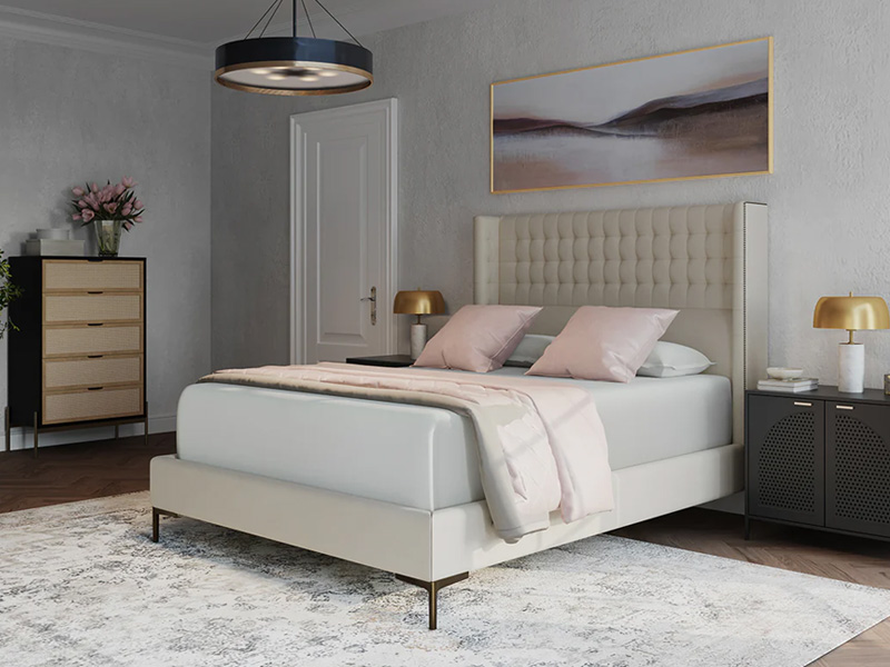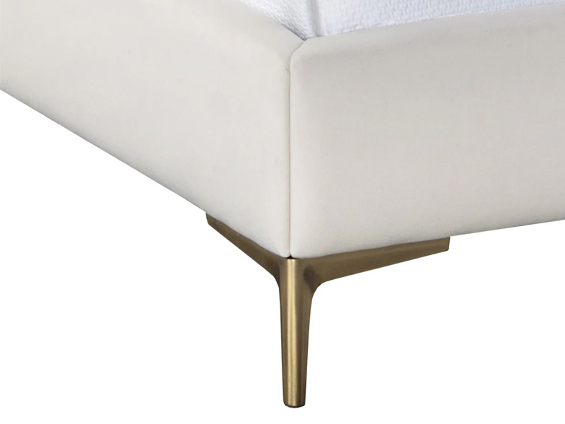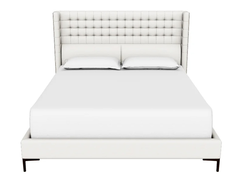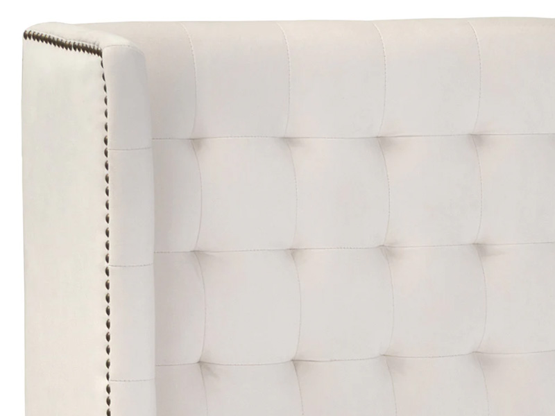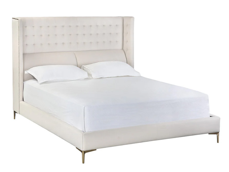 Drift to a blissful escape while resting in the Cairo bed. This design features deep tufting and a generously cushioned headrest for added comfort. Hand-hammered nailheads and antique brass legs complete the look. Stocked in antonio porcelain performance fabric. Performance fabric is moisture repellent, durable and easy to clean. No box spring is required and folding slats are included.