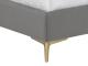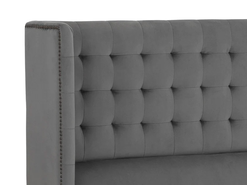 Drift to a blissful escape while resting in the Cairo bed. This design features deep tufting and a generously cushioned headrest for added comfort. Hand-hammered nail heads and antique brass legs complete the look. Stocked in antonio charcoal performance fabric. Performance fabric is moisture repellent, durable and easy to clean. No box spring is required and folding slats are included.