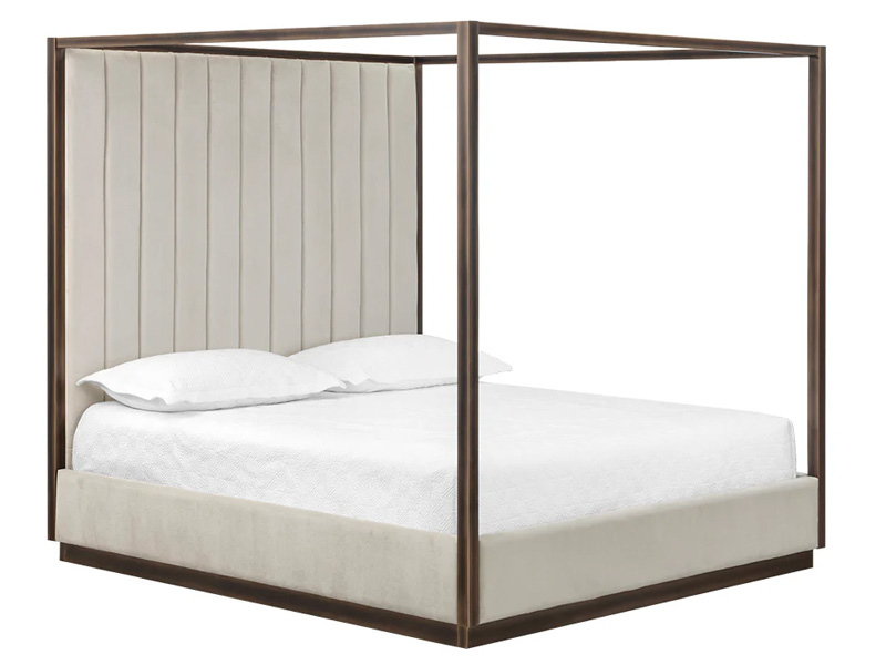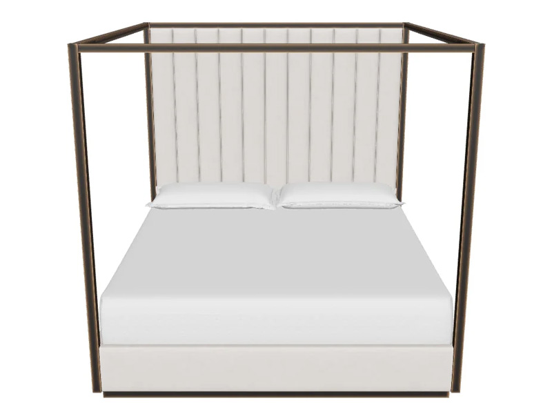 Boasting a regal design, this classic bed features a grand canopy frame that will certainly add a stunning appeal to any bedroom space. Upholstered in our piccolo processo performance fabric and features vertical tufting on the headboard. Completed with a rustic bronze iron frame. No box spring is required and slats are included. Performance fabric is moisture repellent, durable and easy to clean.