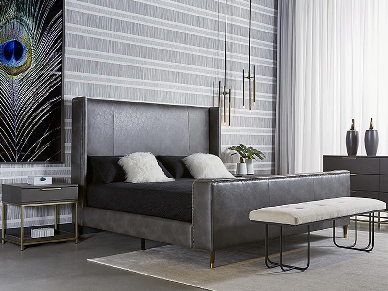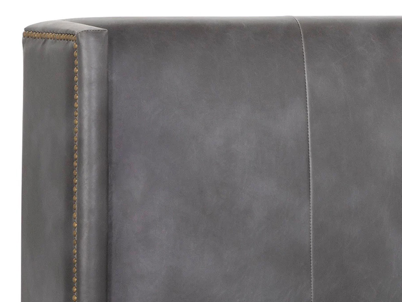 Create a moody escape with this classically designed bed. Finished in a sleek overcast grey faux leather with a single row of brass nailheads. No box spring is required and folding slats are included. Handle With Care: This design has been crafted with faux leather. Faux leather is manufactured to reflect the natural characteristics of leather; as such, colour variations, markings wrinkles, grooves, and light scratches are appreciated characteristics. No two pieces will be alike. Visit our Product Care page for more information on how to ensure the lasting beauty of this piece.