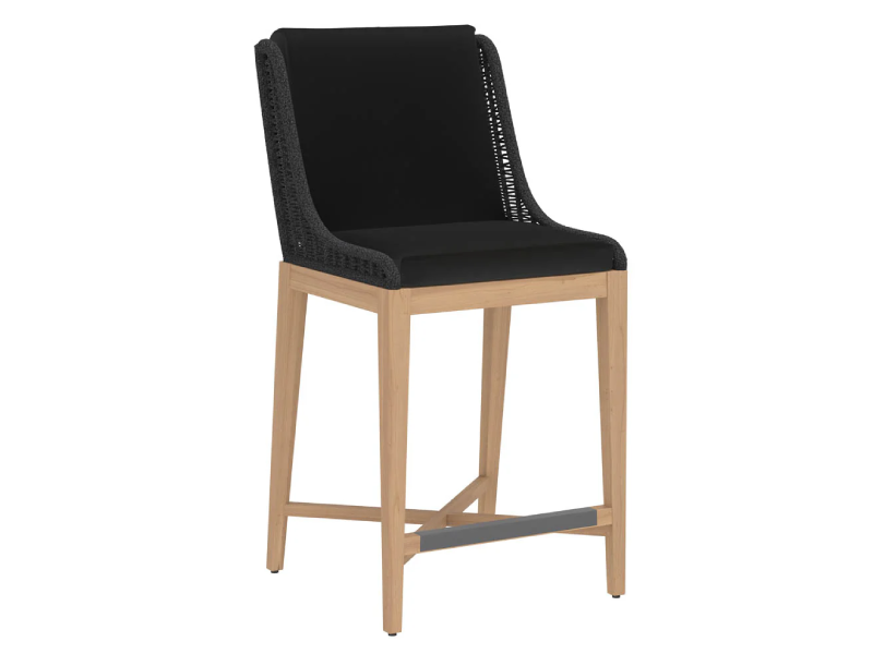 Create a modern outdoor dining space with this beautiful barstool. Features a durable arashi black fabric seat and dark greymix weave exterior with a natural teak wood base. Suitable for indoor and covered outdoor spaces.