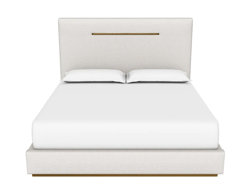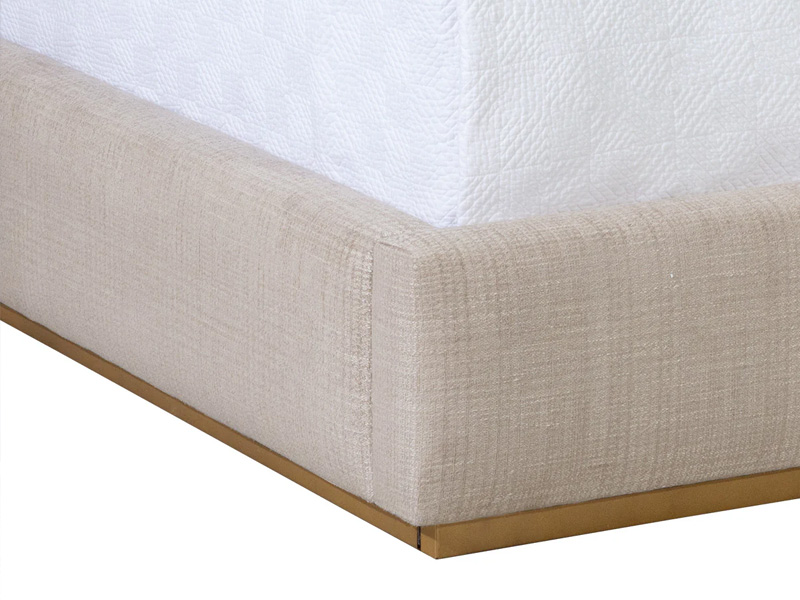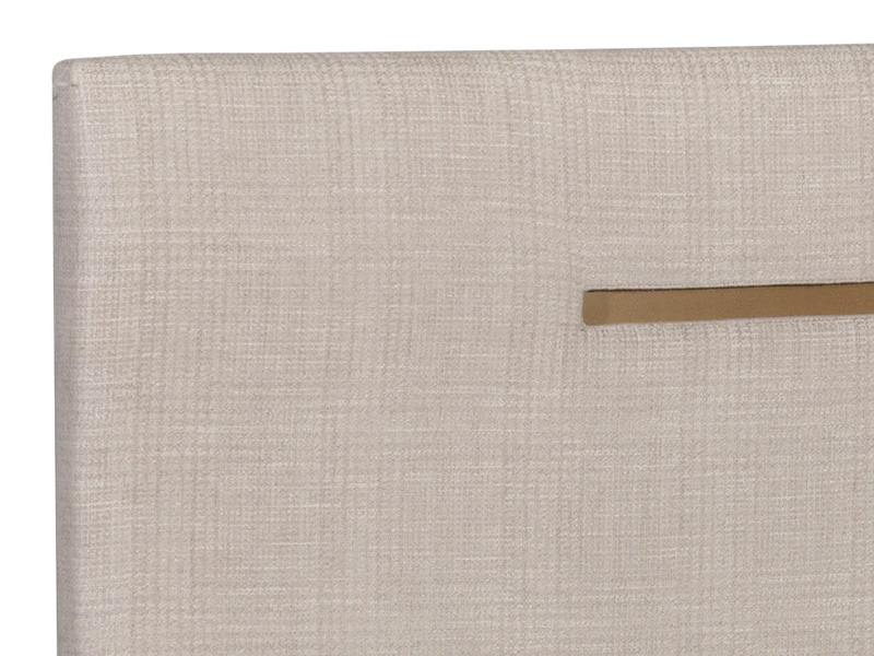 Polished and sleek, this bed boasts a stellar modern design that is full of comfort. Upholstered in naya check cream fabric and features stylish rustic bronze steel accenting.
