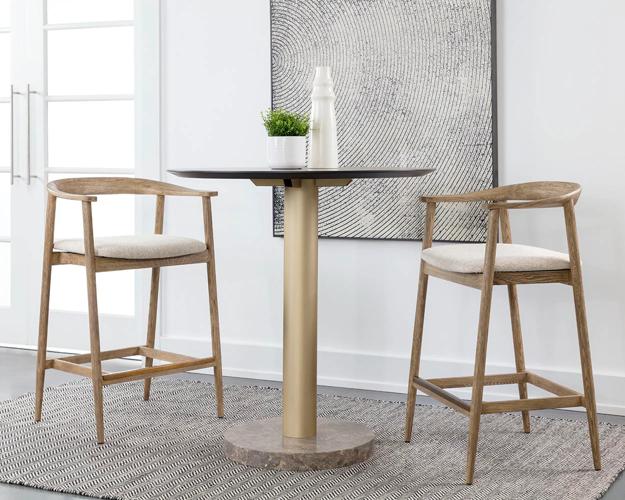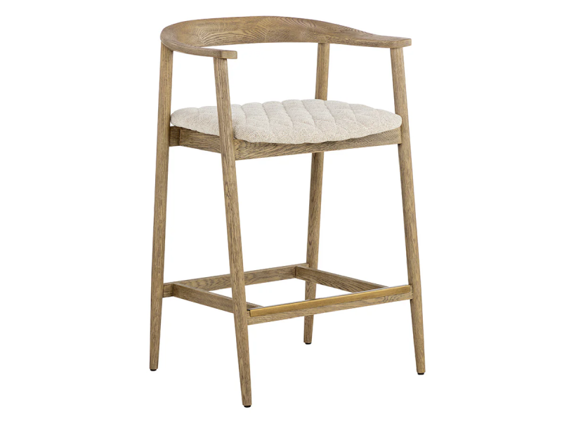 An alluring mid-century counter stool that embraces the beauty of simplicity. Features a comfortable, quilted cushion in dove cream fabric. Completed with a brown, weathered solid oak wood frame and a powder-coated metal footrest in an antique brass finish. As wood is an organic, porous material, these pieces will contain natural variation of texture and may also exhibit fine indentations and cracks. Wood pieces will also display a disparity of colour and grain, and visible knots and burls that add to the character of each piece.