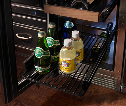 All Perlick shelves are full extension, pulling completely out of the cabinet for easy stocking and retrieving of product. Shelving is black vinyl-dipped to provide additional vibration protection, and shelving glides smoothly in and out of the cabinet on stainless steel ball bearing glides.