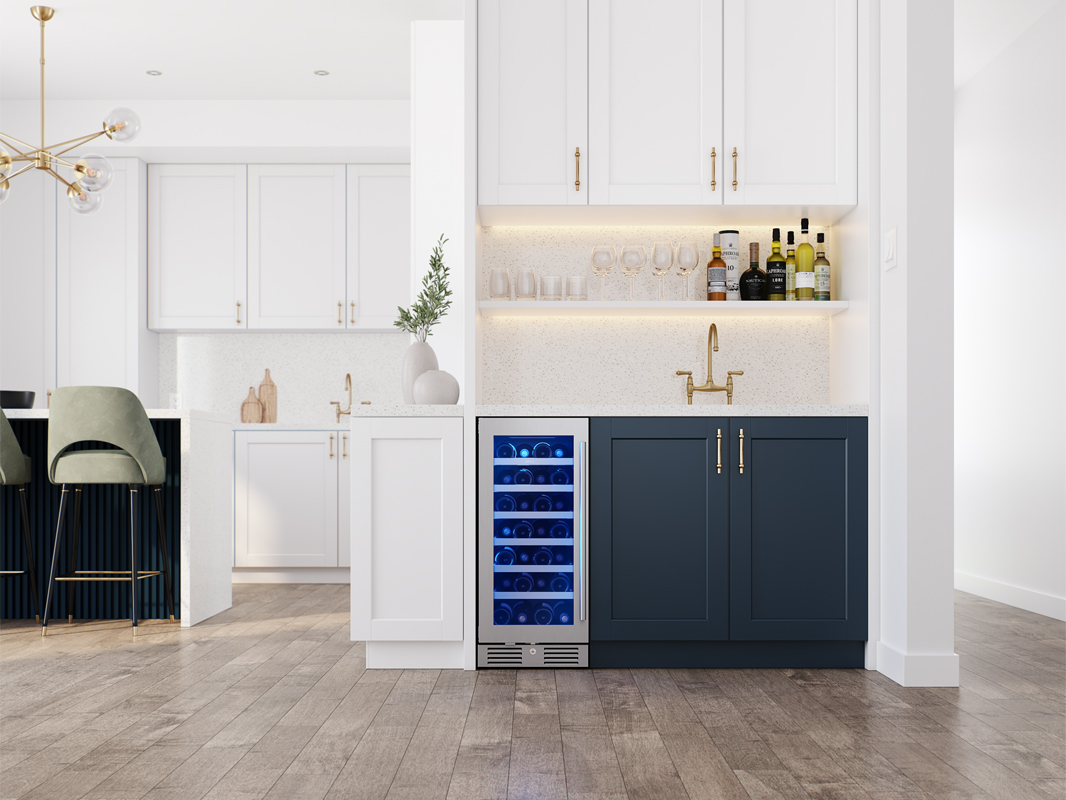 For the lover of fine wine and fine design, our Presrv™ 15” Single Zone Wine Cooler is as cool as it looks. Featuring Full-Extension Wood Racks, PreciseTemp™ temperature control for maintaining accurate temperatures, Active Cooling Technology to ensure even cooling, and a vibration dampening system to minimize wine disturbance. New enhancements include mood-setting LED light strips in three colors and four light levels and an updated kickplate with lock.