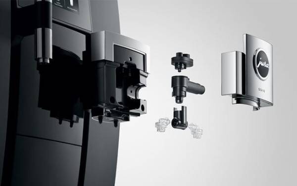 The maintenance of the new GIGA X8 is just as straightforward, logical and intuitive as its operation. Original JURA maintenance products and integrated rinsing and cleaning programmes ensure TÜV-certified hygiene at the touch of a button. The milk system is also very easy to clean. The fully automatic process is started with just a touch on the display and ensures perfect cleanliness. The solid dual spout can be dismantled in just a few easy steps. The milk spouts at the front are readily accessible and easy to replace if necessary