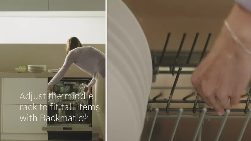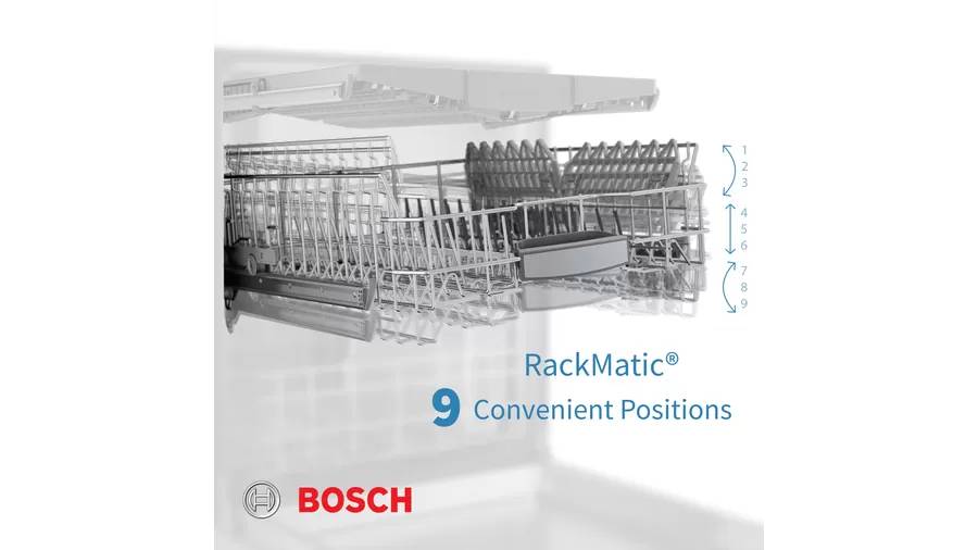 RackMatic RackMatic adjustable upper rack easily adjusts to 9 different positions to allow taller items like stemware to fit, while leaving room for pots and pans below.