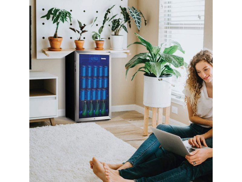 Danby DBC117A1BSSDB-6 freestanding beverage fridge is a 3.1 cu ft. mini fridge, designed to store beer, pop and a variety of other drinks. This unit is a convenient yet modern option for anyone looking to enhance their hosting space. Whether you're updating your wet-bar or adding extra drink storage to your basement, this Danby beverage cooler offers compact versatility with its adjustable wired shelves and blue LED lights. The smooth back design allows for flush installation near a wall, and the reversible door hinge allows you to adjust for either left or right-handed door opening. Additionally, this unit features an easy to use mechanical thermostat, with a temperature range of 2 to 10 C (35.6F 50F). With its sharp clean lines, this mini bar fridge is designed to blend with any decor style seamlessly.