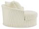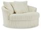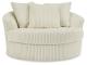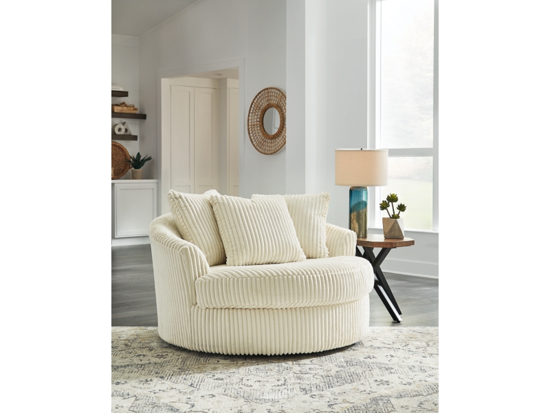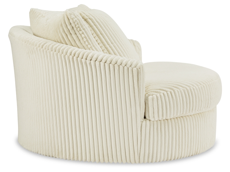 Plush and posh. Showcase your eye for on-trend texture with the statement-making cord upholstery of this oversized swivel accent chair. Its stunningly soft fabric entices in an ivory hue, complementing contemporary color palettes. Sink into the spacious cushion and plan to stay a while—this cozy living room chair highlights your high-end approach to comfort and style.