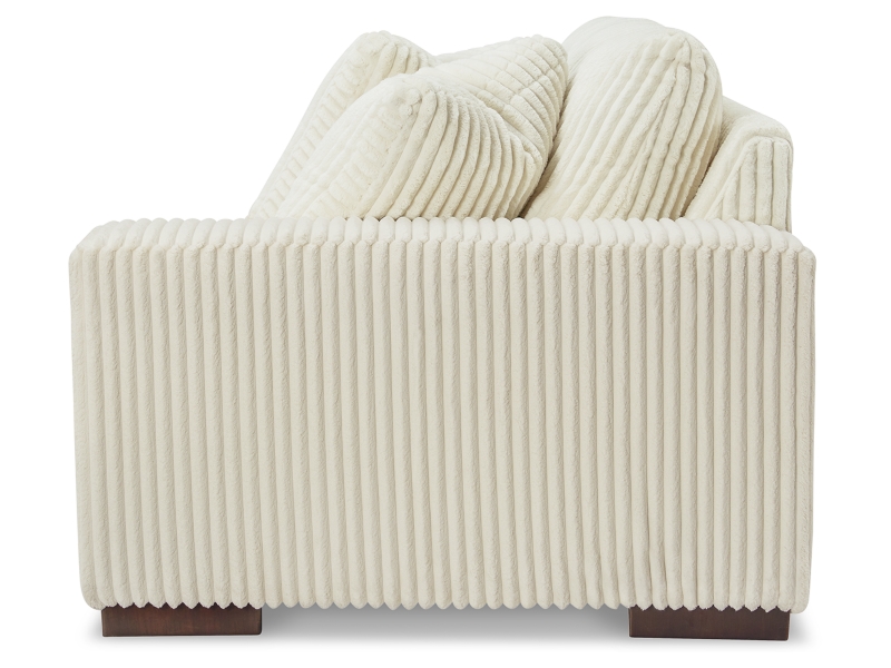 A High-end trending look, stunning soft wide cord fabric. All sides are finish with accent low profile legs. Loose reversible seat cushions and backs. Feather blend toss pillows.