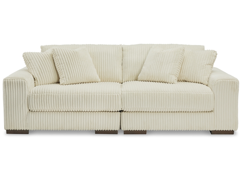 A High-end trending look, stunning soft wide cord fabric. All sides are finish with accent low profile legs. Loose reversible seat cushions and backs. Feather blend toss pillows.