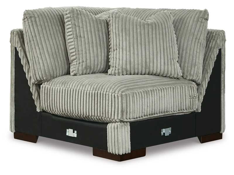 A High-end trending look, stunning soft wide cord fabric. All sides are finish with accent low profile legs. Loose reversible seat cushions and backs. Feather blend toss pillows.