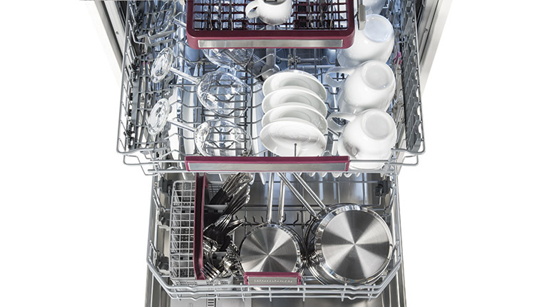 One of the most popular features among high-end dishwashers, this versatile rack is tailor-made for those occasions when you need to create extra space for cutlery and small items. Its clever dimensions mean you can still place tall stemware on either side and small cups or bowls underneath in the upper rack. When you prefer to place tall items in the middle of the upper rack, simply slide this third rack out completely.