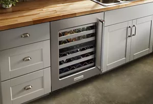provides a built-in look within a standard 24" base cabinet, so your style stands out, not the appliance. Hidden hinges allow the wine cellar door to sit flush with surrounding cabinet fronts when closed yet easily swing open a full 115 degrees.