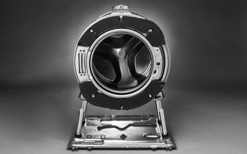 The Quattro Construction™ consist of four shock absorbers which transfers drum vibrations to the bottom plate. The whole construction is fitted inside the casing which prevents vibrations further. Shockingly clever.