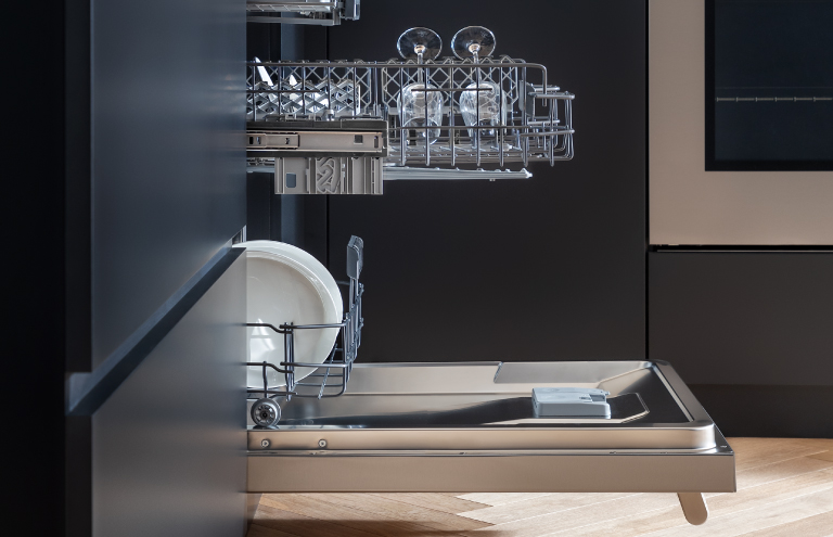 The flexible and foldable third rack with dedicated spray arm is perfect for flatware, silverware and smaller items. The height adjustable middle rack can be moved to create space even when the basket is fully loaded.
