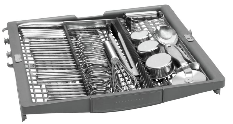 A Bosch dishwasher with a standard 3rd rack provides the perfect space for flatware and large utensils and offers 30% more loading capacity*. *Vs. Bosch dishwashers with two racks. And the unique V shape leaves room below both sides for taller items like stemware.