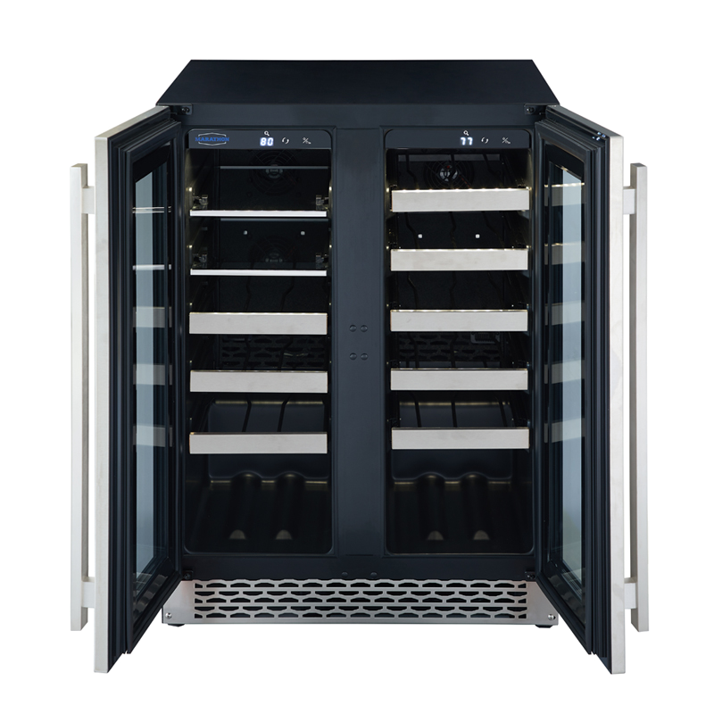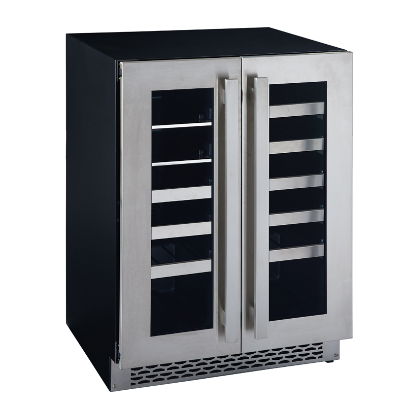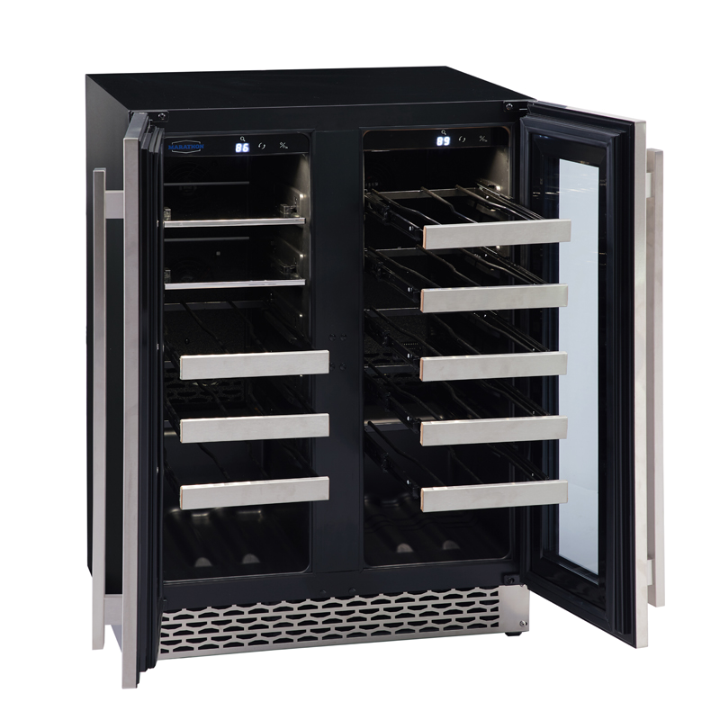 Marathon strives to engineer high performance and luxury appliances. The Marathon 24” French door wine and beverage centre is just that. Zero clearance Stainless Steel doors enable this cooler to fit into any kitchen or bar setting. A LED temperature display, and full extension ball bearing shelves make operation quick and simple. Individual temperature zones allow you to chill and store your favourite wine and beverages. Adjustable leveling legs and classic grill design provides height flexibility for specific built-in applications.