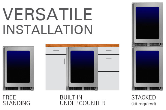 - Professional styling: stainless-steel framed glass door, sturdy full-length handle, sleek stainless shelf fronts and stainless steel toe kick adjustable to 4″