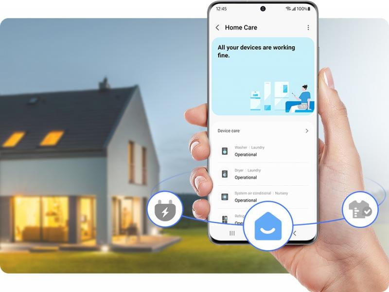 * Available on Android and iOS devices. A Wi-Fi connection and a Samsung account are required. ** SmartThings Energy currently works with around 40 Samsung home appliances that are SmartThings enabled. These include washing machines, clothes dryers, dish washers, air conditioners, air purifiers, vacuum cleaners, ovens, hoods, cooktops, microwave, TVs (from June 2022) and energy meters.