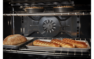 features a unique bow-tie design with heating element and fan that provide even airflow and consistent temperatures throughout the entire oven for crisp, flaky baked goods, juicy, evenly browned roasts and flavorful, caramelized vegetables.