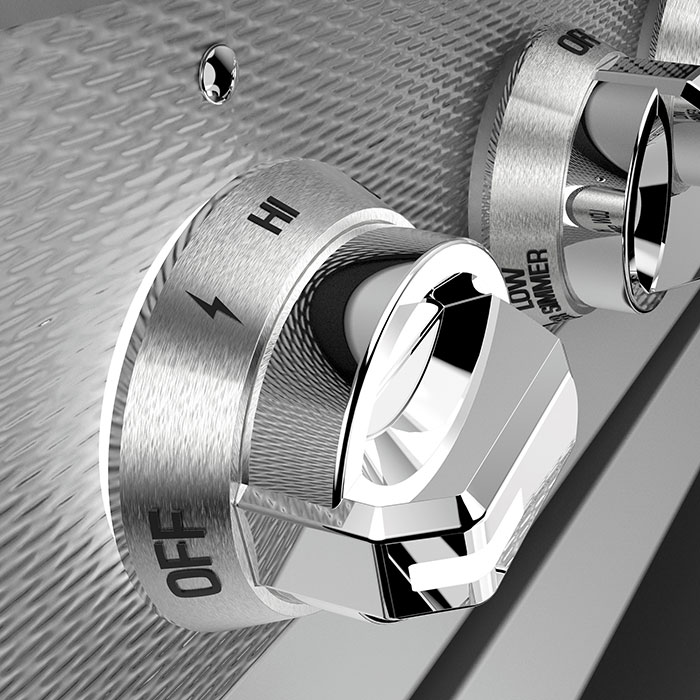 - Zamak die-cast range and oven control knobs.
