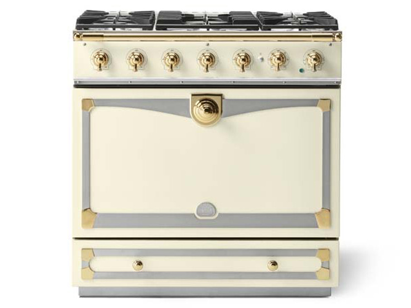 Designed especially for the US market, the single oven "Albertine" range is the baby to the CornuFé family. With one large multi-function convection oven, and seven unique cooking modes, the range has five powerful brass gas burners and one large storage drawer. The CornuFé 90 is available in 8 classic colors and 4 Suzanne Kasler Couleurs. All Colors are available in 3 trim package options, including Stainless Steel and Polished Brass, Stainless Steel and Satin Chrome and Stainless Steel and Polished Chrome.