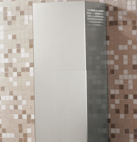 The chimney hood installs flush under a cabinet, above most cooktops and ranges. For a more contemporary look, the system can be wall-mounted with matching 8-to-10-foot duct cover