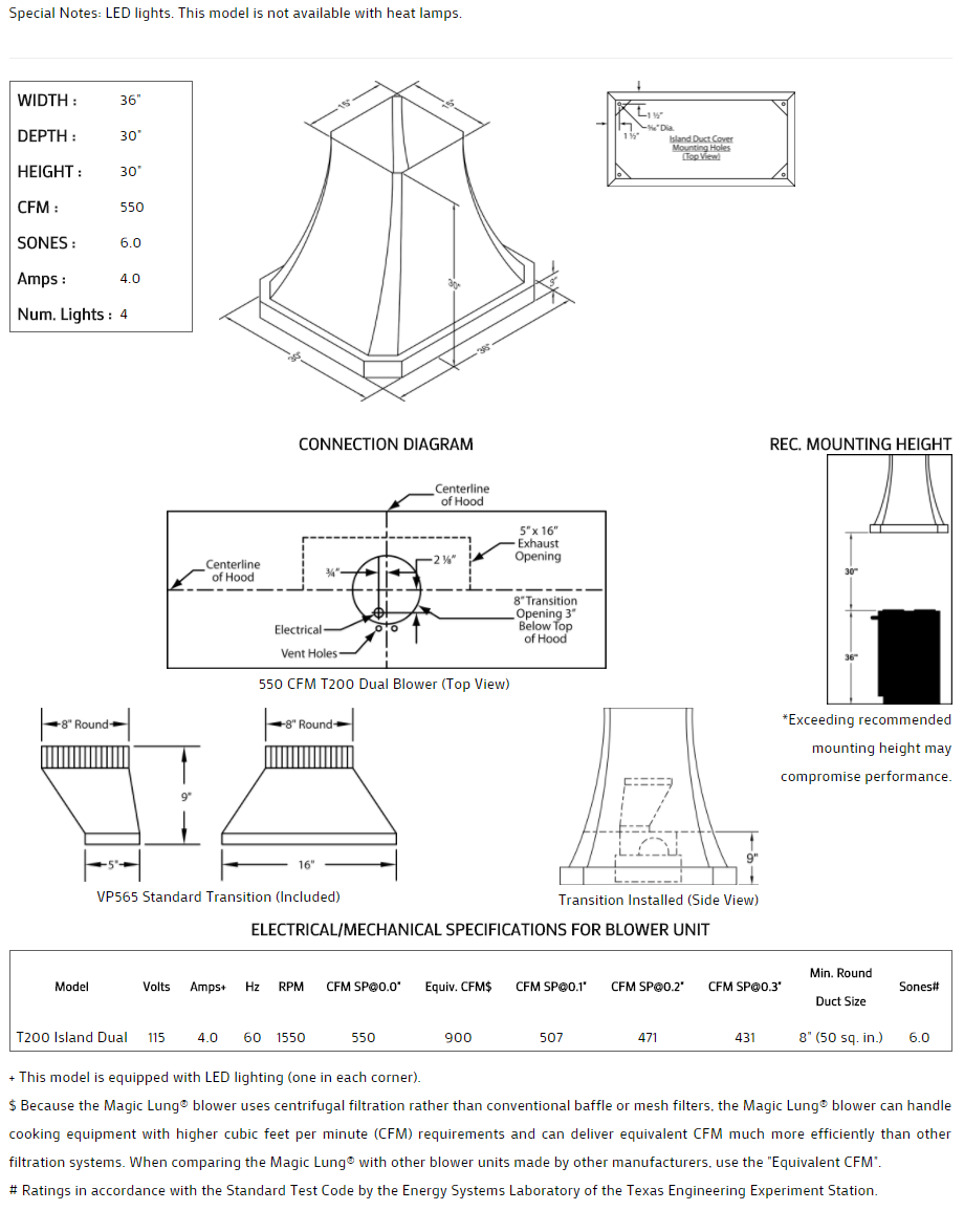 Concave with lip styling. Click on the models for a list of our base model numbers for standard sizes; simply select the model you need. This model is available in stainless steel with standard mirror stainless trim. All Vent-A-Hood Magic Lung products are suitable for use in damp locations (outdoor applications such as a covered patio) when installed in a GFCI protected branch circuit. Recommended mounting height is 30" above the cooking surface.