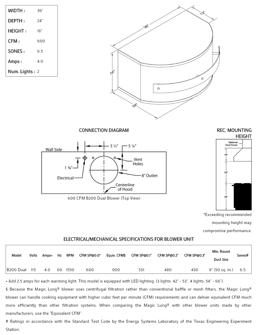 Rounded front with stand-off trim styling. Click on the models for a list of our base model numbers for standard sizes; simply select the model you need. This model is available in stainless steel with standard mirror stainless trim. All Vent-A-Hood Magic Lung products are suitable for use in damp locations (outdoor applications such as a covered patio) when installed in a GFCI protected branch circuit. Recommended mounting height is 30" above the cooking surface.