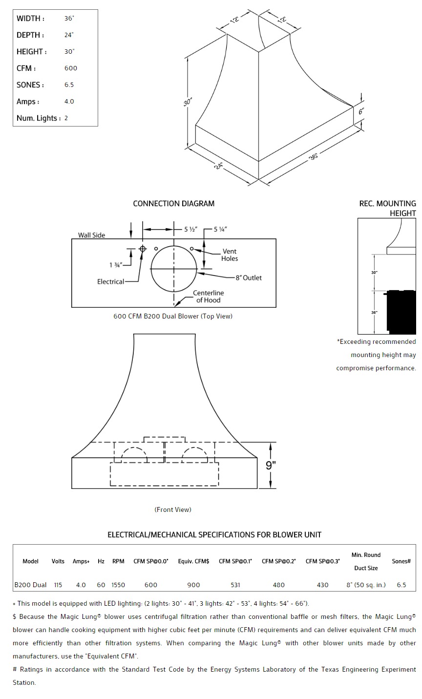 Concave with thick lip styling. Click on the models for a list of our base model numbers for standard sizes; simply select the model you need. This model is available in stainless steel with standard mirror stainless trim. All Vent-A-Hood Magic Lung products are suitable for use in damp locations (outdoor applications such as a covered patio) when installed in a GFCI protected branch circuit. Recommended mounting height is 30" above the cooking surface.