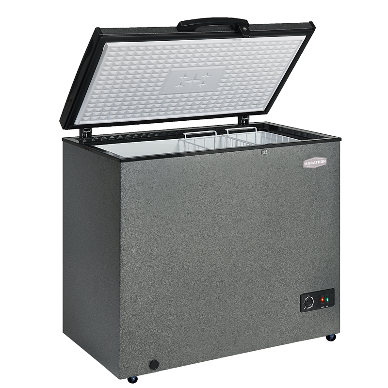 Your favorite foods will be safely preserved and easily organized in this spacious Marathon 7.1 cu.ft. Double Row Basket Chest Freezer. In a unique durable granite finish, this freezer comes with an innovative 2-tiered Double-Row Basket design for easy storage and organization of your favourite frozen goods. Other features include, a heavy-duty white aluminum liner, defrost drain, 4 baskets, a power and compressor light, safety lock and handle and an adjustable thermostat. Marathon appliances are "Engineered to Perform" and are backed by the Industry's Best 2 Year Parts and Labour Warranty