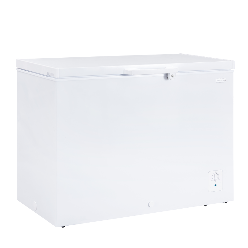 Perfect for when more freezer space is needed. This spacious Marathon 8.6 cu.ft. chest freezer comes with wheels for mobility and a rust resistant and easy to clean white aluminum interior. Other features include a convenient front defrost drain, two wire baskets, adjustable thermostat and a durable handle with safety lock. Marathon appliances are "Engineered to Perform" and are backed by the Industry's Best 2 Year Parts and Labour Warranty
