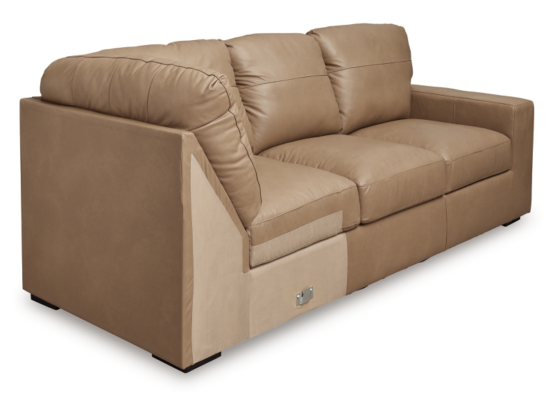 This right-arm facing sofa with corner wedge is made with a combination of 100% top grain leather and faux leather upholstery. Pairs with other items in the series to make a sectional.