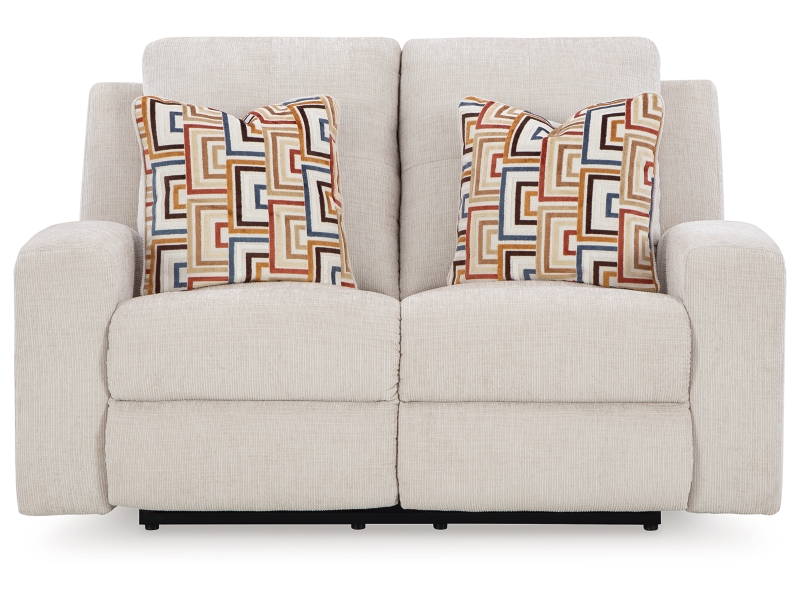 Trendy track arm motion sofa with a plush crosshatch chenille with luxuriously soft hand. Featuring a vibrant contemporary cut velvet pillow and overlapping concentric square motifs. 2 over 2 sofa with wide seats, manual recline functions with tufted backs.