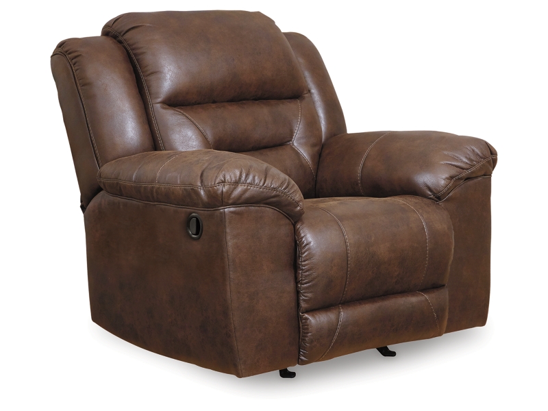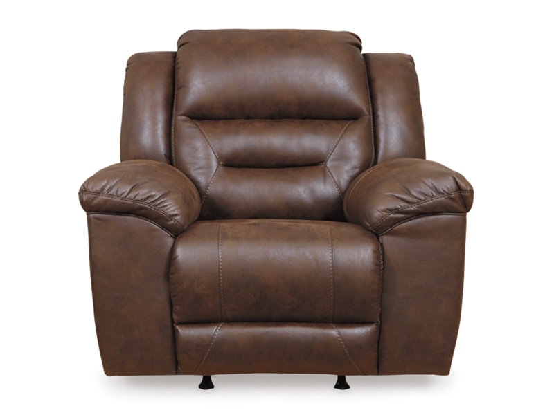 For those who love the cool look of leather but long for the warm feel of fabric, this rocker recliner delivers both with ease. Its high-performance padded faux leather is remarkably durable and easy to clean, making it just the thing for family spaces. Channel-stitched back cushions provide indulgent lumbar support for maximum comfort—not to mention fashion-forward flair.