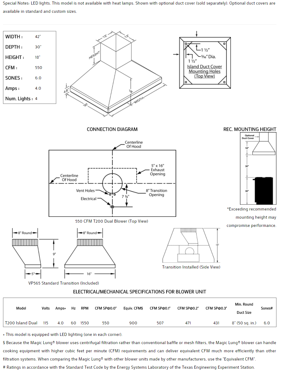 This Euroline Pro Series with Emerald Lip is boldly designed to cover light residential, "commercial type" cooking equipment. Heat lamps are not available on this model. Available in popular standard or custom paint colors, stainless steel, real brass, real copper, or hammered copper. Recommended mounting height is 30" from the cooking surface. Shown with matching island duct cover (sold separately), available in standard sizes for 8', 9', and 10' ceiling heights or in custom sizes. All Vent-A-Hood products are suitable for use in damp locations (outdoor applications such as a covered patio) when installed in a GFCI protected branch circuit.