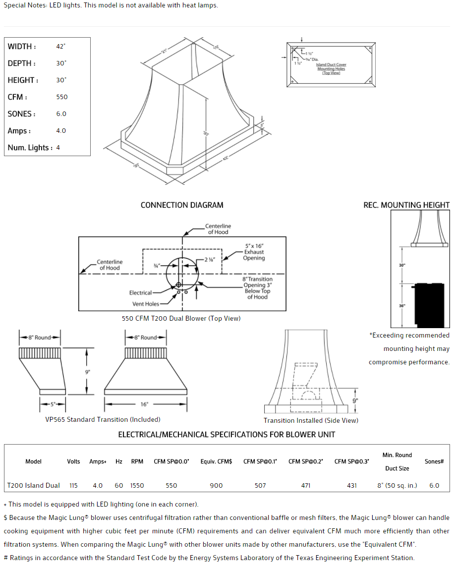 Concave with lip styling. Click on the models for a list of our base model numbers for standard sizes; simply select the model you need. This model is available in stainless steel with standard mirror stainless trim. All Vent-A-Hood Magic Lung products are suitable for use in damp locations (outdoor applications such as a covered patio) when installed in a GFCI protected branch circuit. Recommended mounting height is 30" above the cooking surface.