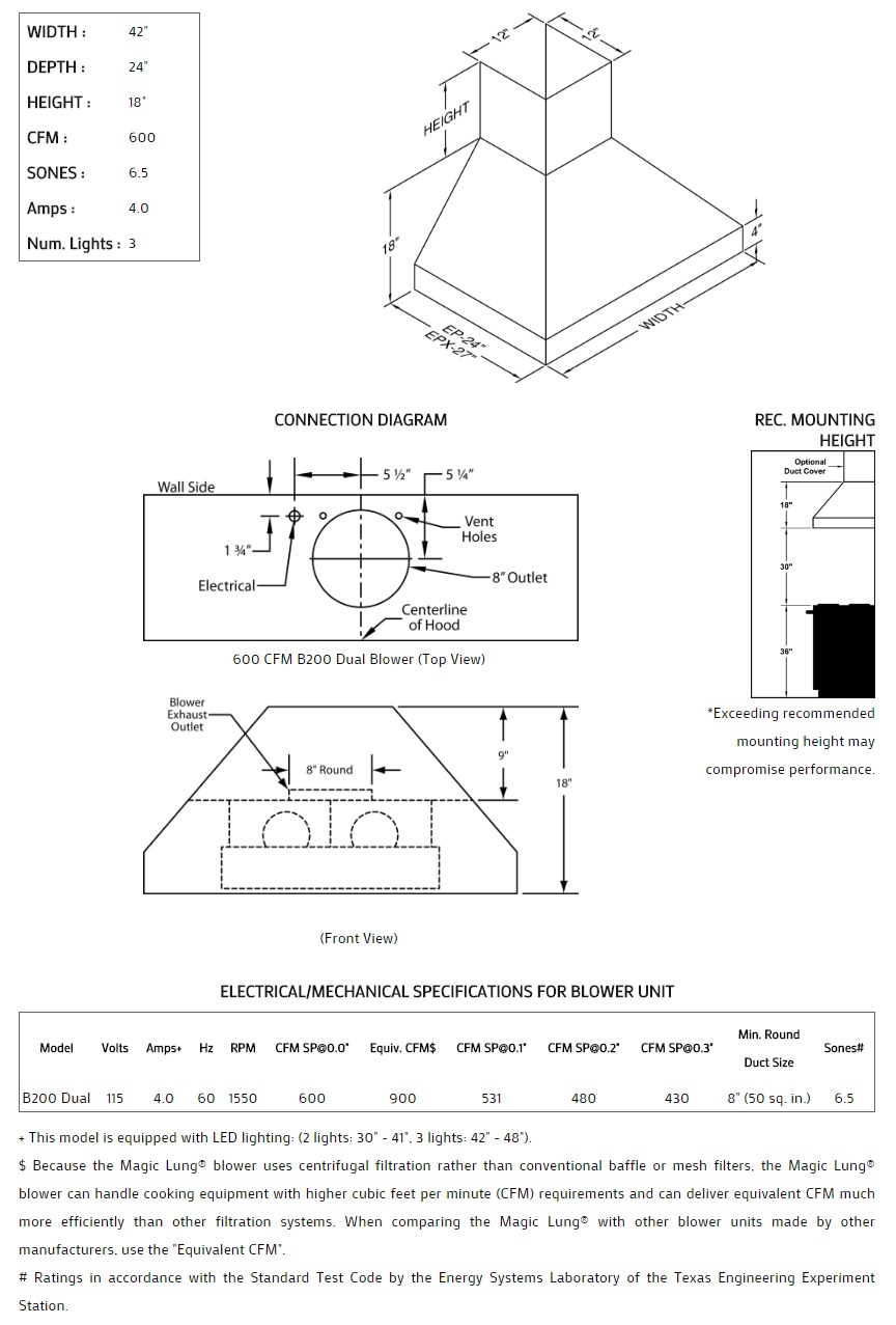 This Euroline Pro Series is boldly designed to cover light residential, "commercial type" cooking equipment. To order a 27" depth, add an 'X' after 'EP' in the model number. The Euroline Pro Series with Emerald Lip is also available with a 26" wide x 14" deep top to allow for higher CFM requirements . Heat lamps are not available on this model. Click on the models for a list of our base model numbers for standard sizes; simply select the model you need, and then specify the finish (painted, stainless steel, real brass, real copper, or hammered copper). Recommended mounting height is 30" from the cooking surface. Shown with matching wall mount duct cover (sold separately), available in standard sizes for 8', 9', and 10' ceiling heights or in custom sizes. All Vent-A-Hood products are suitable for use in damp locations (outdoor applications such as a covered patio) when installed in a GFCI protected branch circuit.
